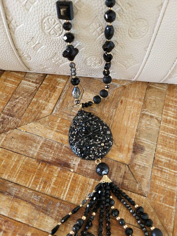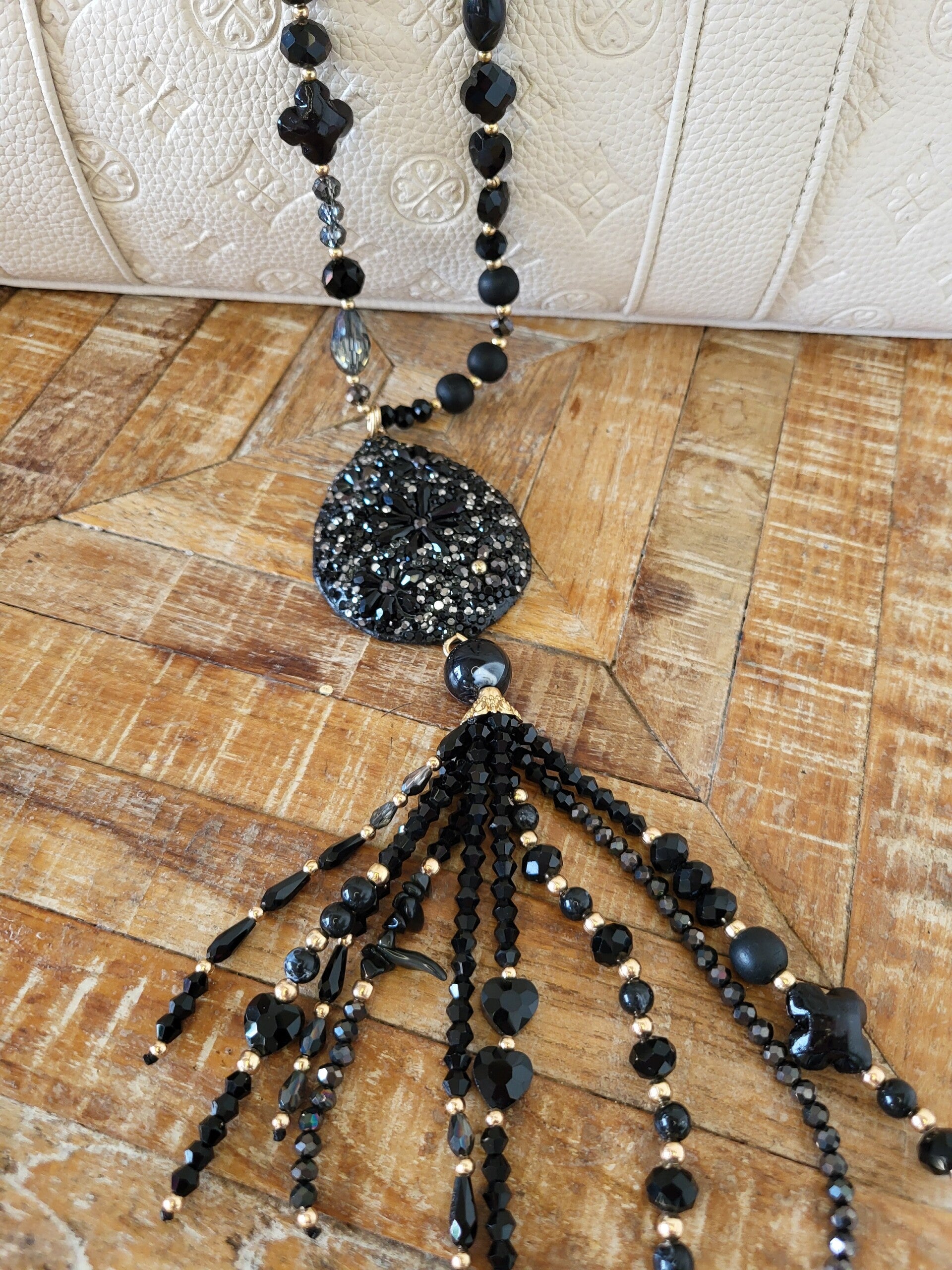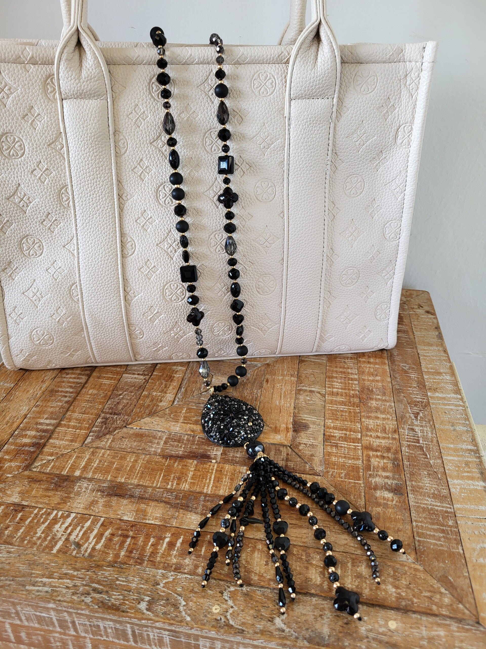 De nieuwe trend de lange ketting! Wij heben ze in vele kleuren. Deze ketting is goud afgewerkt met mooie kralen en steentjes.
