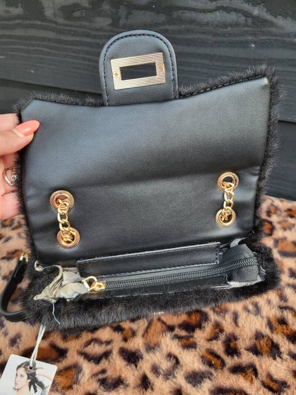 Fluffy Schoudertas – Te Dragen als Korte & Lange Schoudertas – Goudkleurige Ketting & PU Leer Details zwart