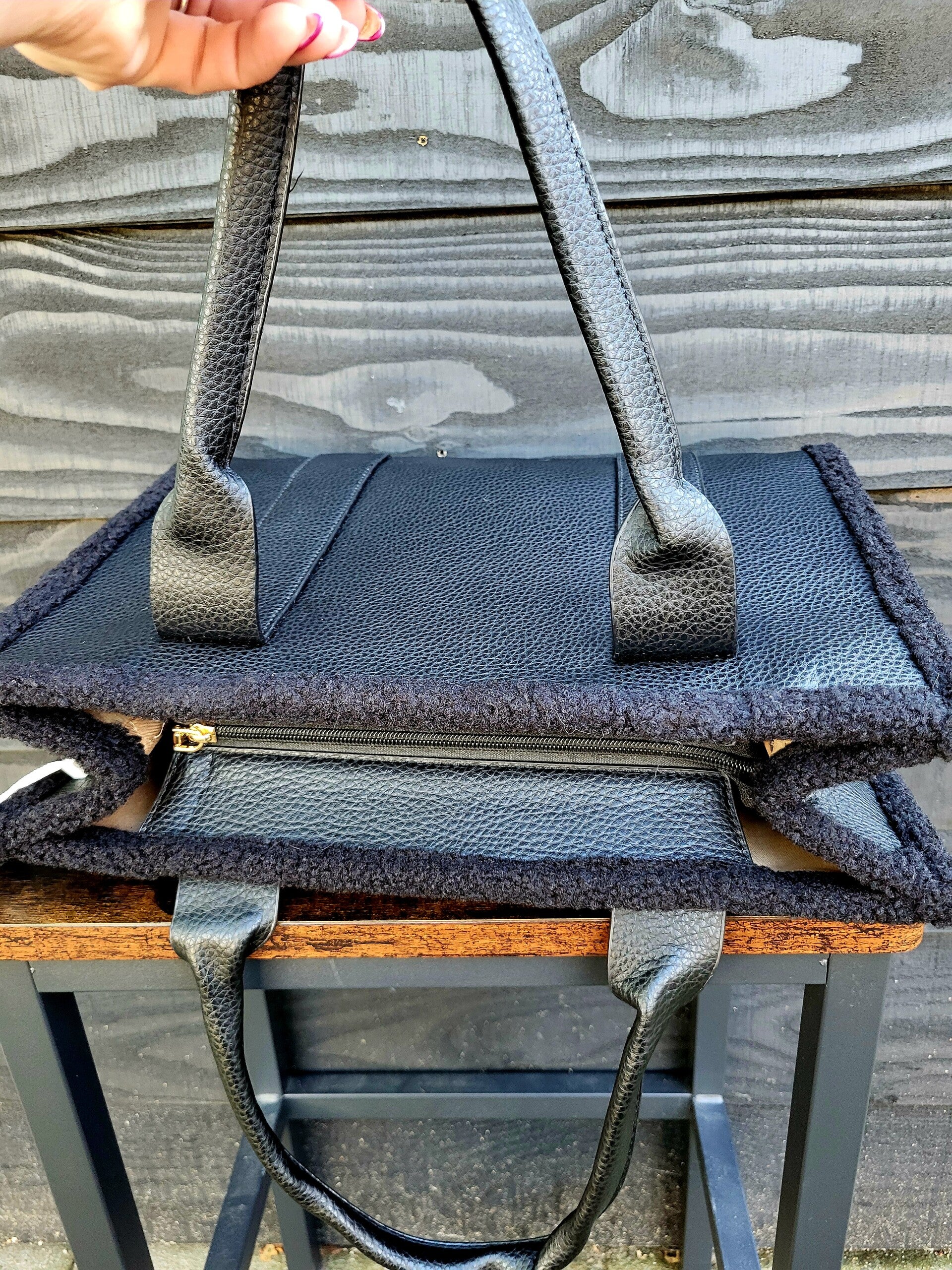 Tote Bag PU-leer met Teddy Stof Zijkanten – Shopper Handtas – 28 x 37 x 11 cm – Trendy & Stijlvol - zwart