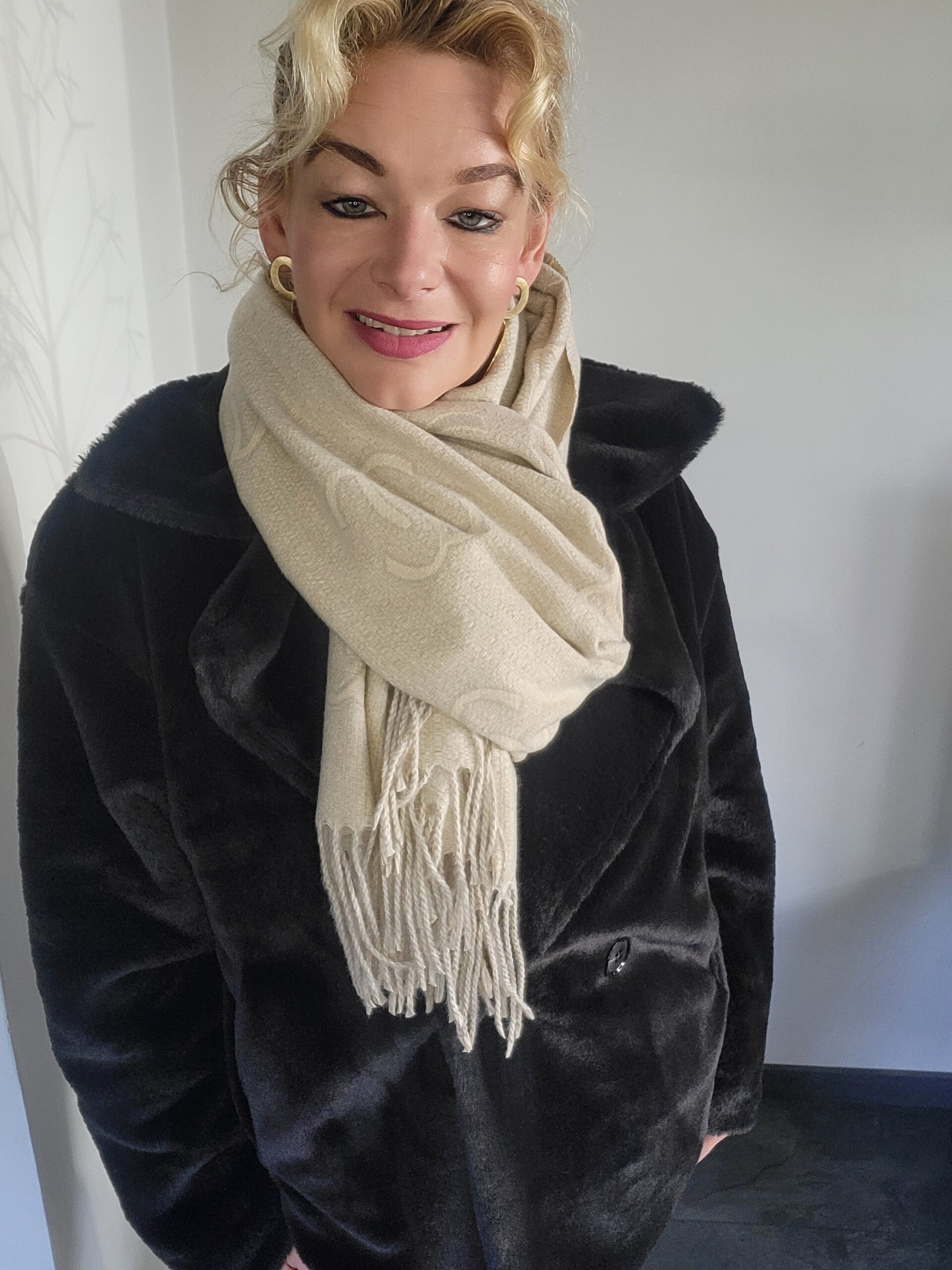 De sjaal is ca. 180 x 50 cm groot en afgewerkt met speelse franjes voor een elegante touch. Het subtiele ingeweven C-patroontje geeft hem een luxe en stijlvolle uitstraling, perfect voor zowel een casual look als een chique outfit.