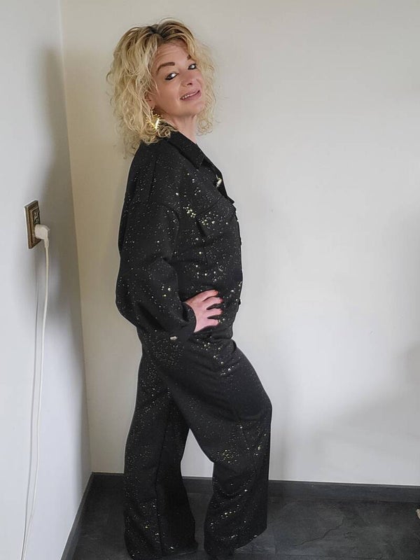Heerlijk comfortabel glitter pak met gouden glitter en knopen. Te dragen t/m maat 44