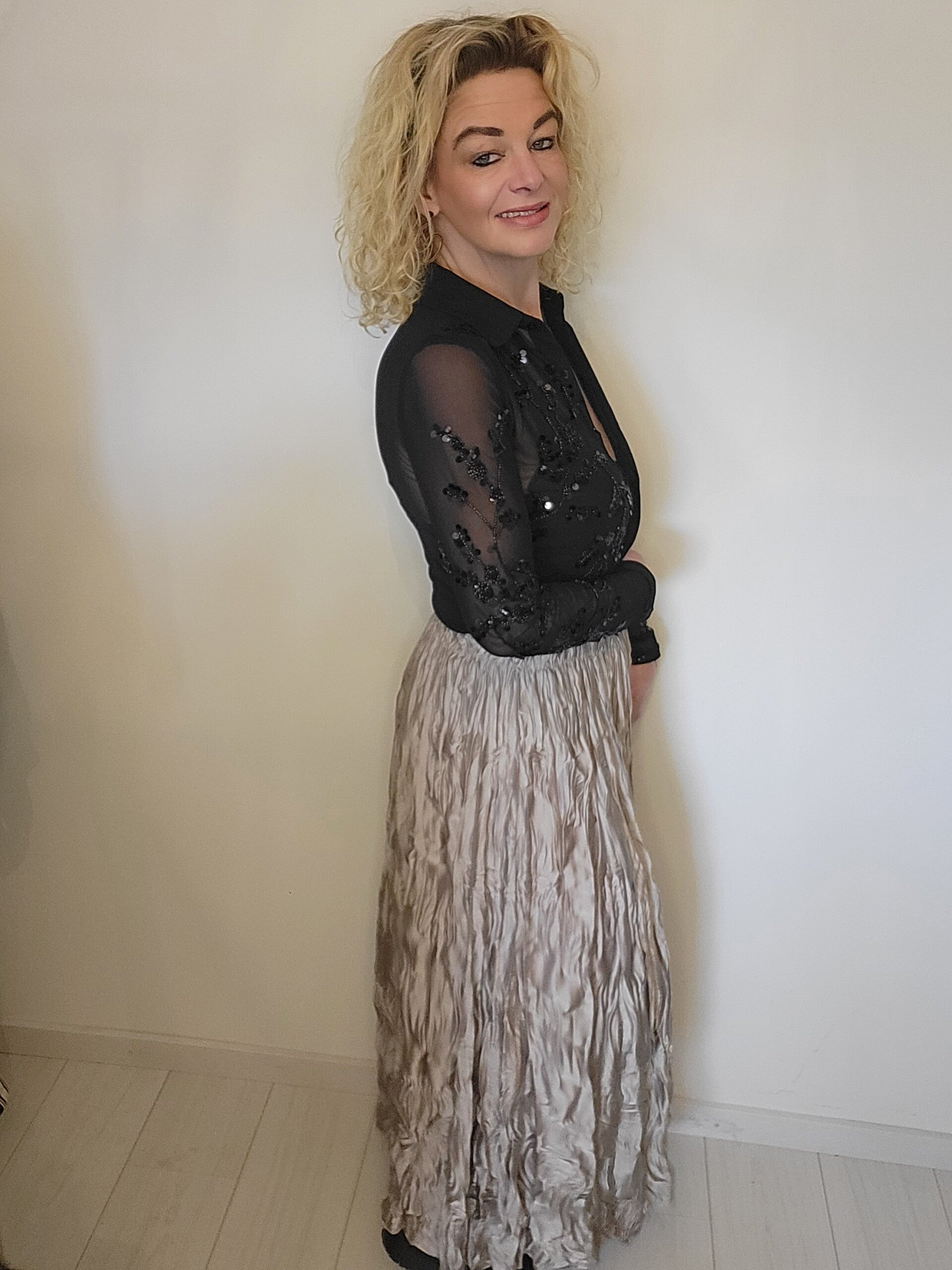 Lange wrinkle rok met elastische boord. Te dragen t/m maat 44