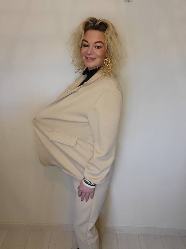 Leuk blazerpak. Met elastische boord en mouwen. Bevat een broche. Te dragen t/m maat 44/46