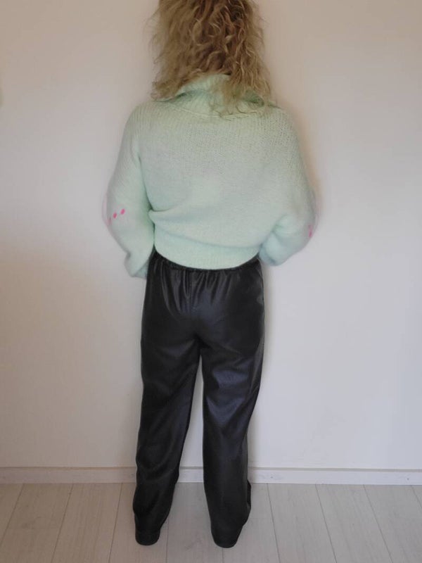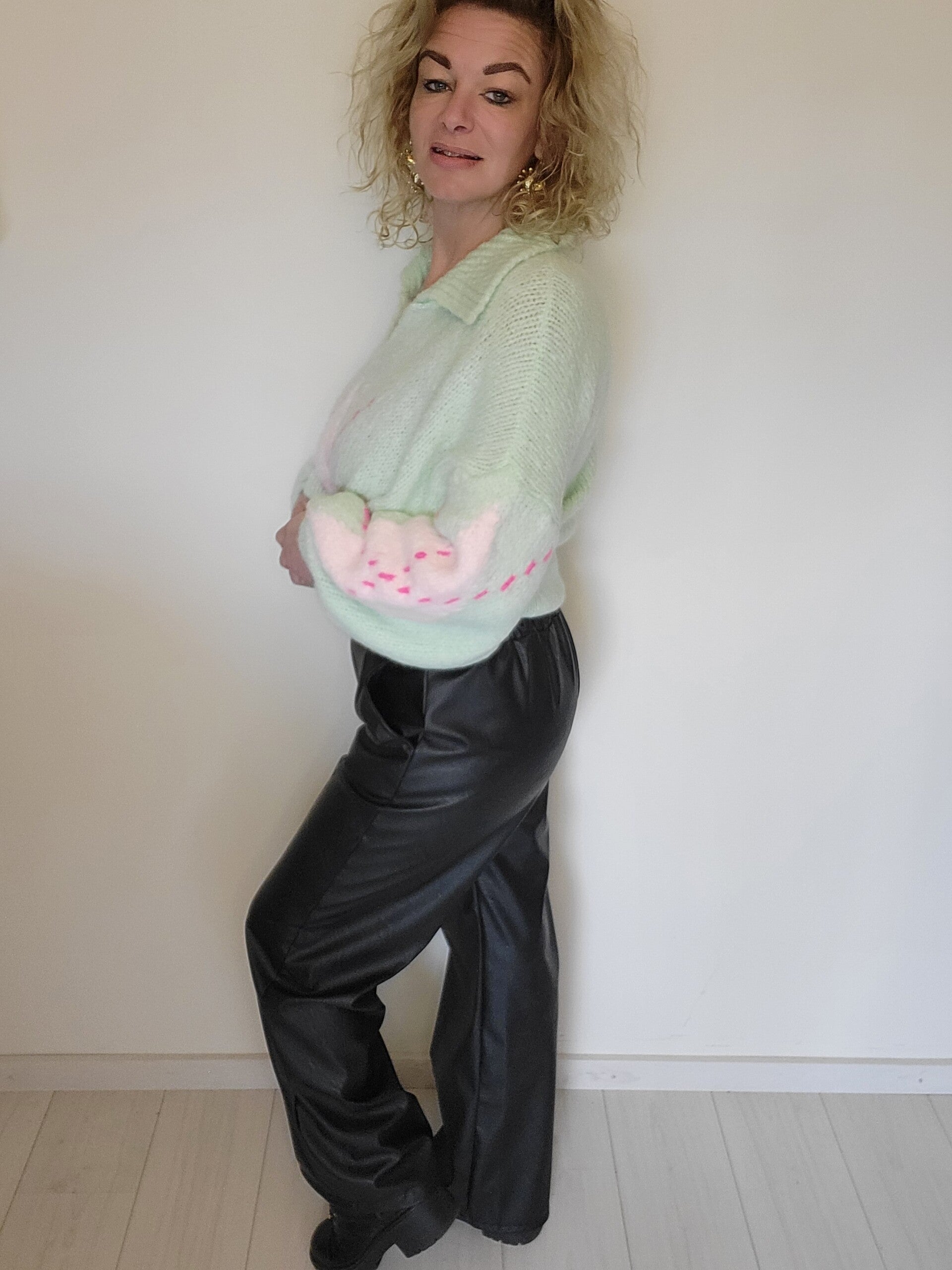 Pu leren wide leg. Met riem. Bevat elastiek aan de achterkant van de boord 2 zakken en een naad in het midden. One size te dragen t/m maat 44
