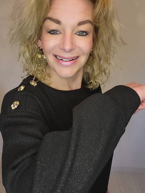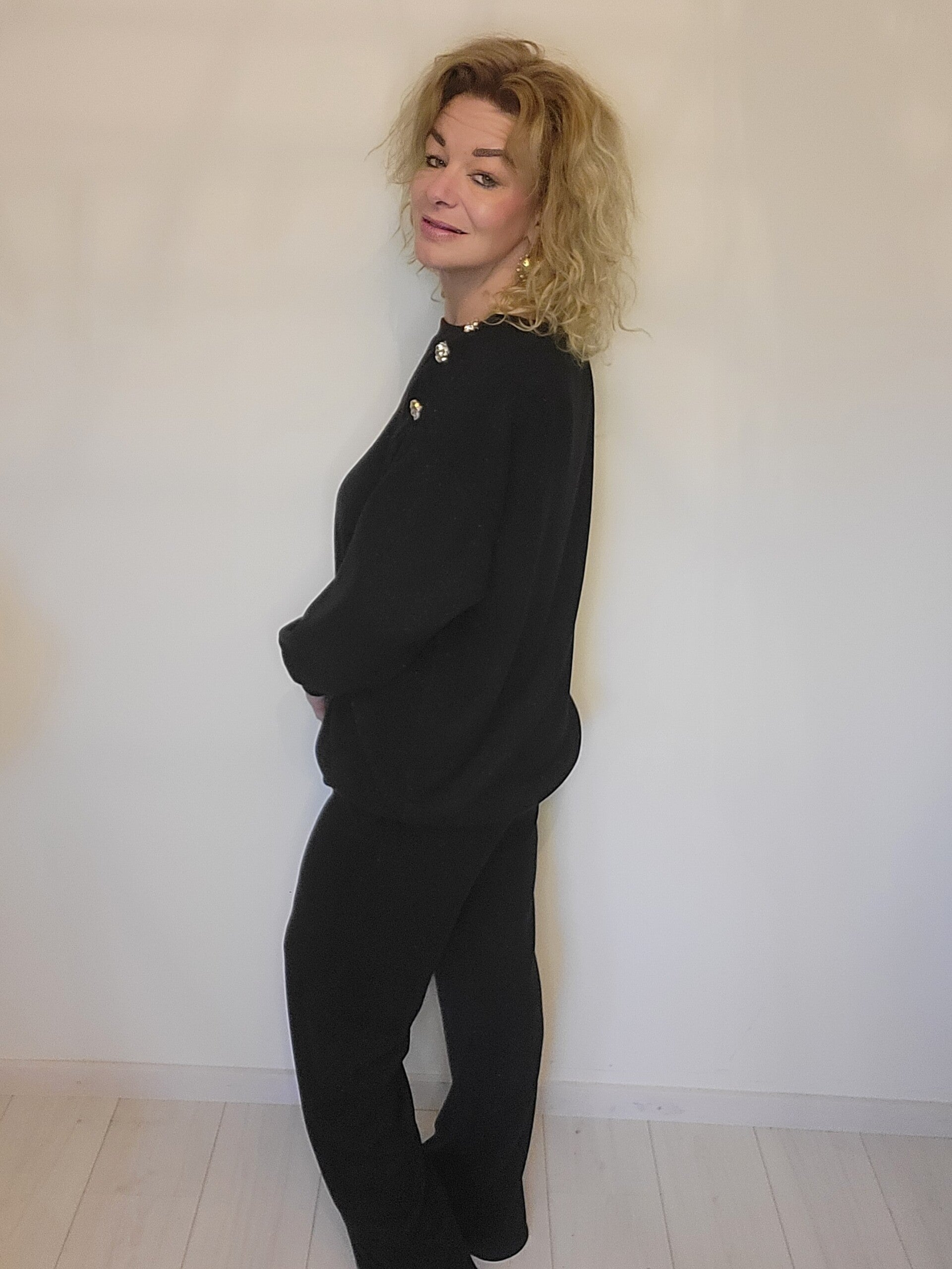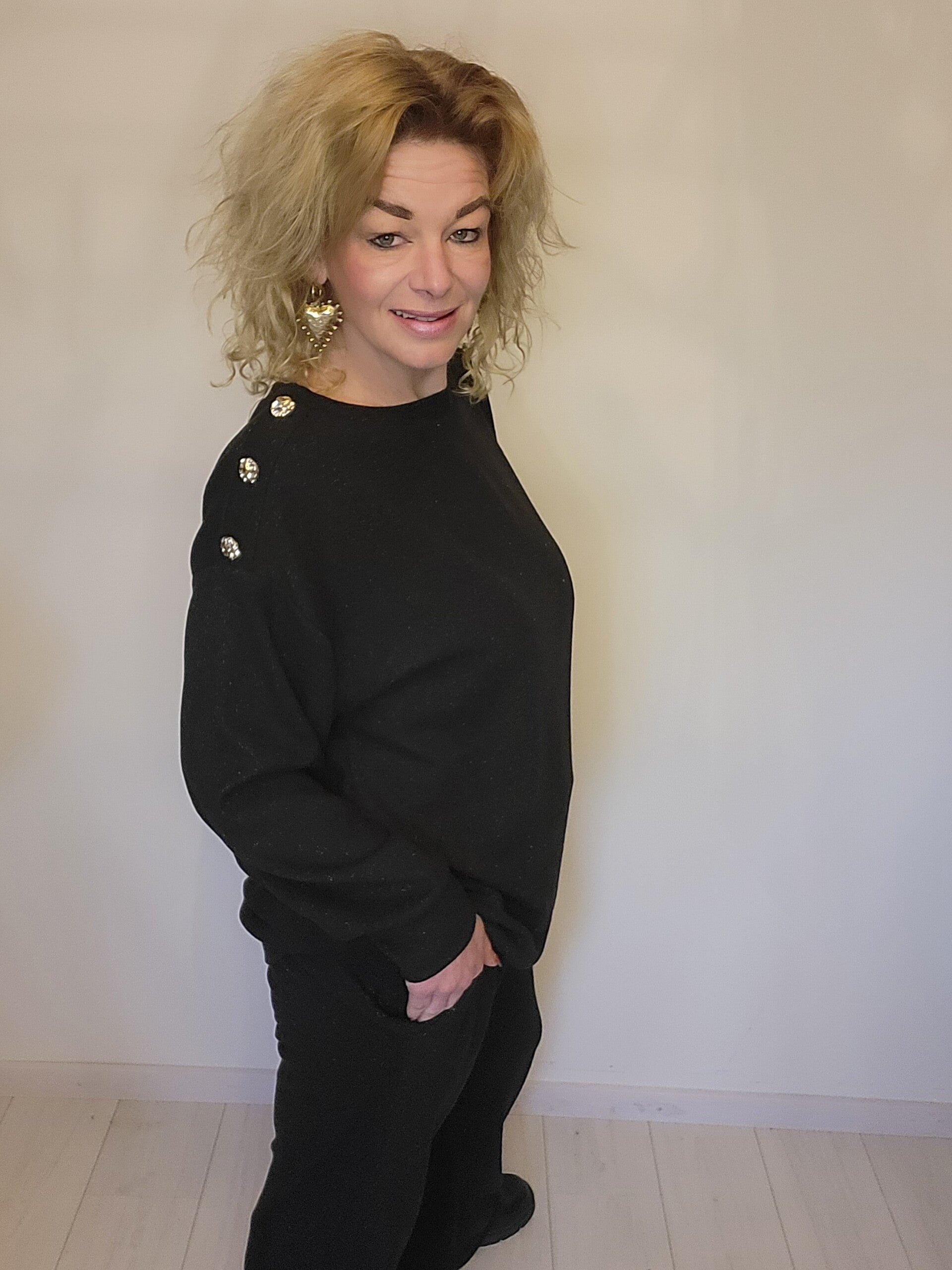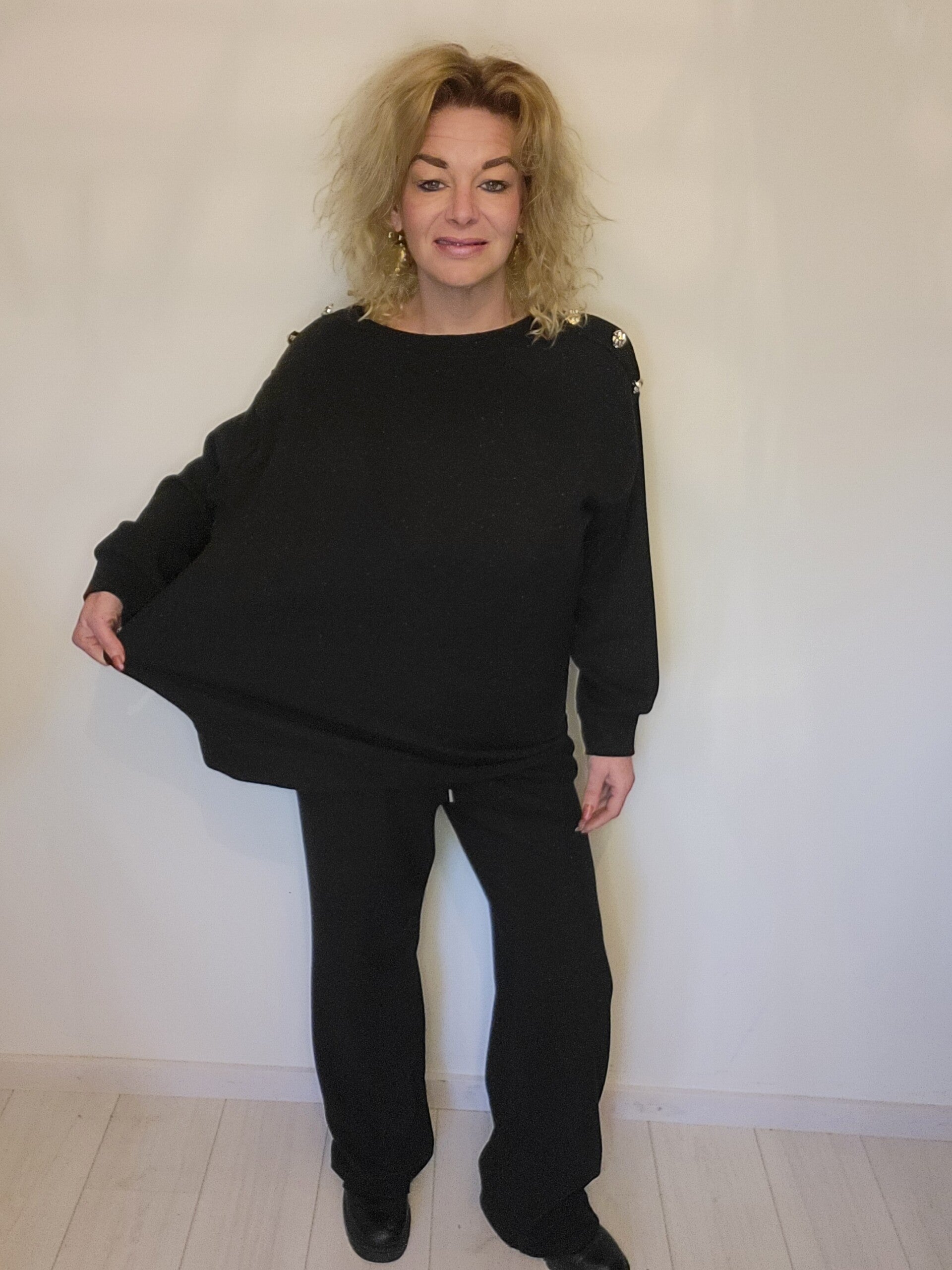 Comfy set met subtiele glitter en knopen op de schouder. Broek bevat een elastische boord. Als je deze set eenmaal aan hebt doe je hem nooit meer uit!