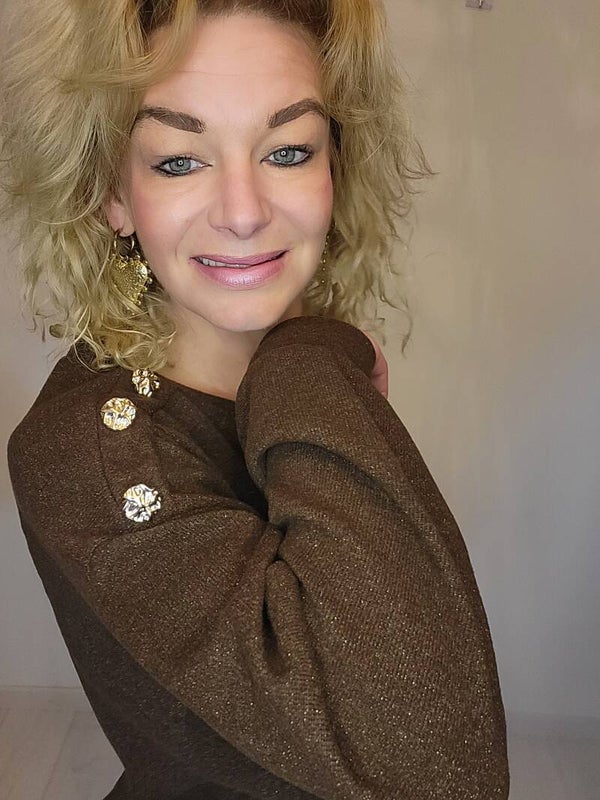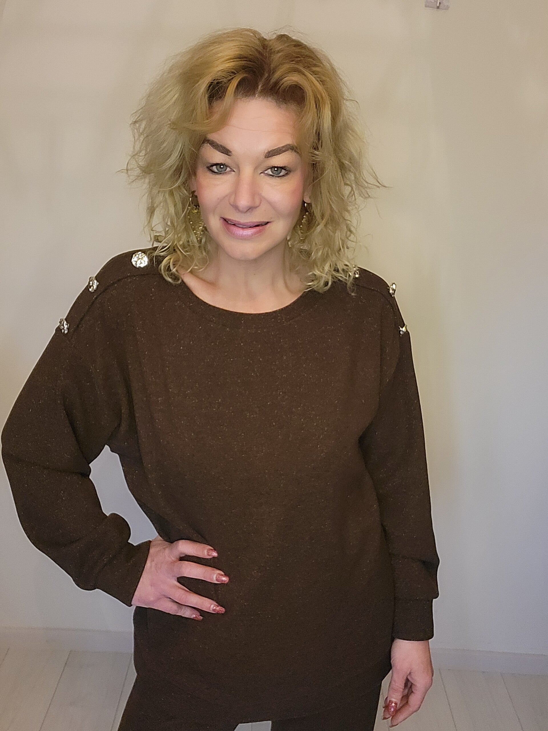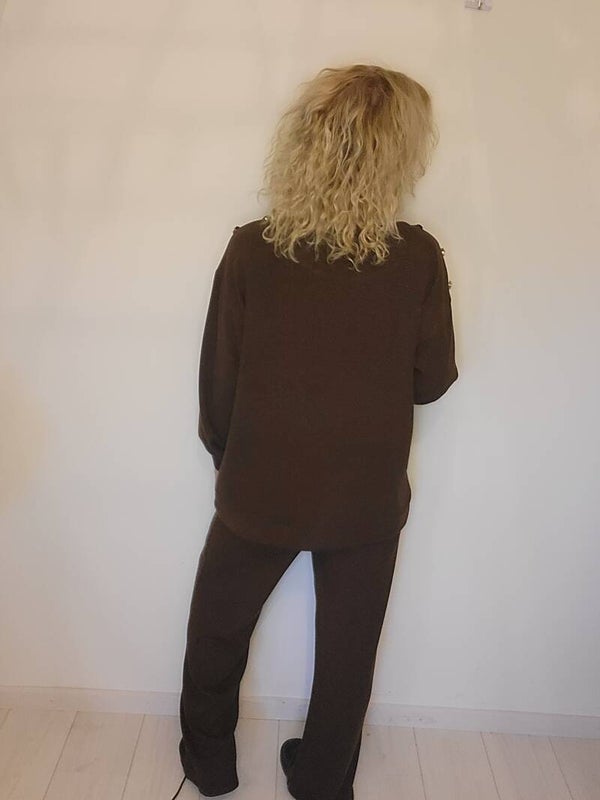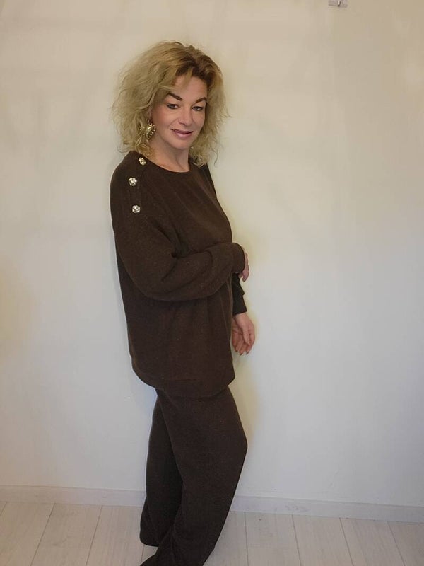 Comfy set met subtiele glitter en knopen op de schouder. Broek bevat een elastische boord. Als je deze set eenmaal aan hebt doe je hem nooit meer uit!