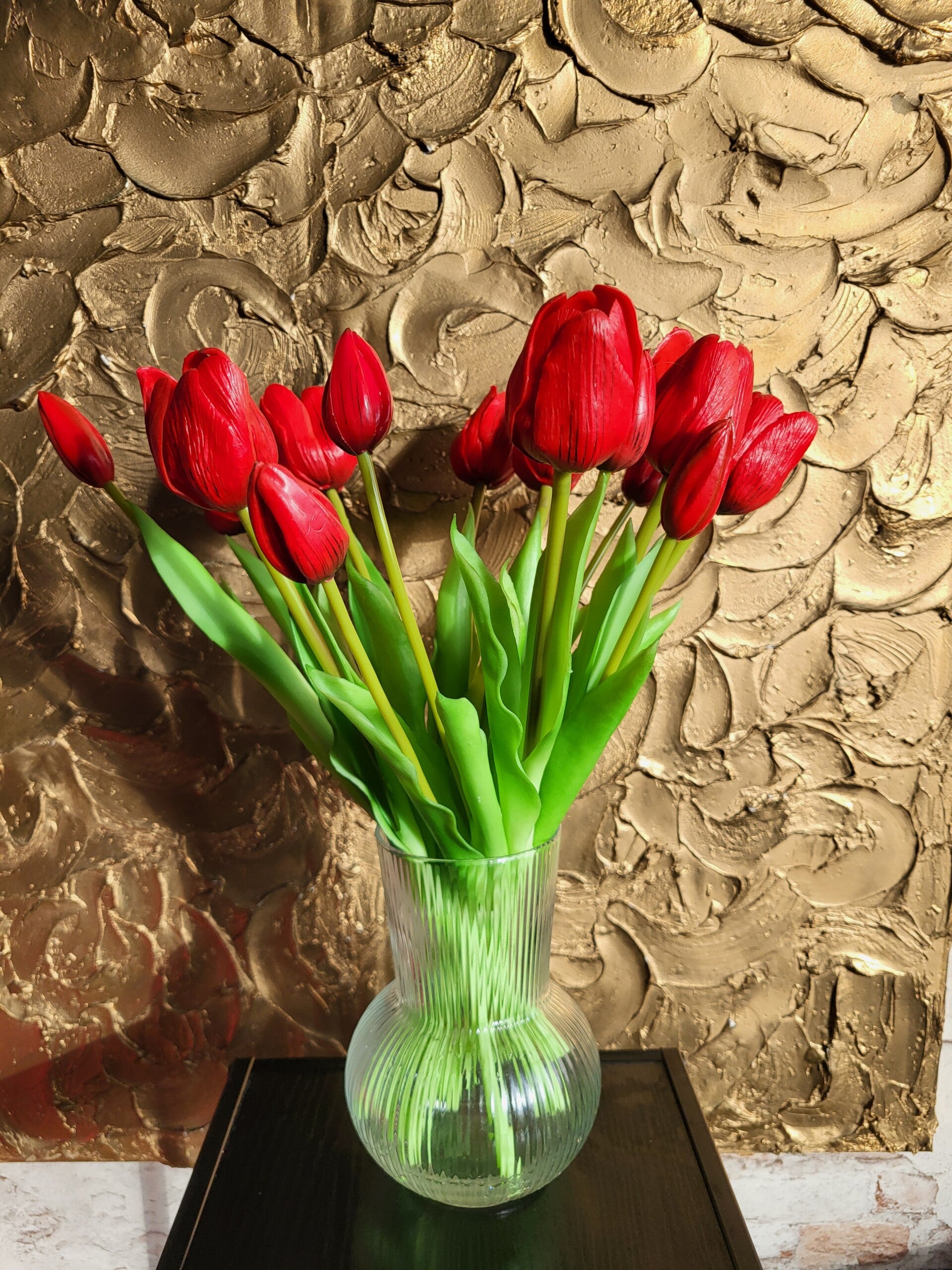 Dit prachtige boeket bestaat uit 14 real touch tulpen in een diepe, warme rode kleur. De tulpen voelen bijna echt aan en zijn nauwelijks van verse tulpen te onderscheiden. Een strak maar tegelijk vrolijk boeket dat meteen sfeer brengt in huis.
