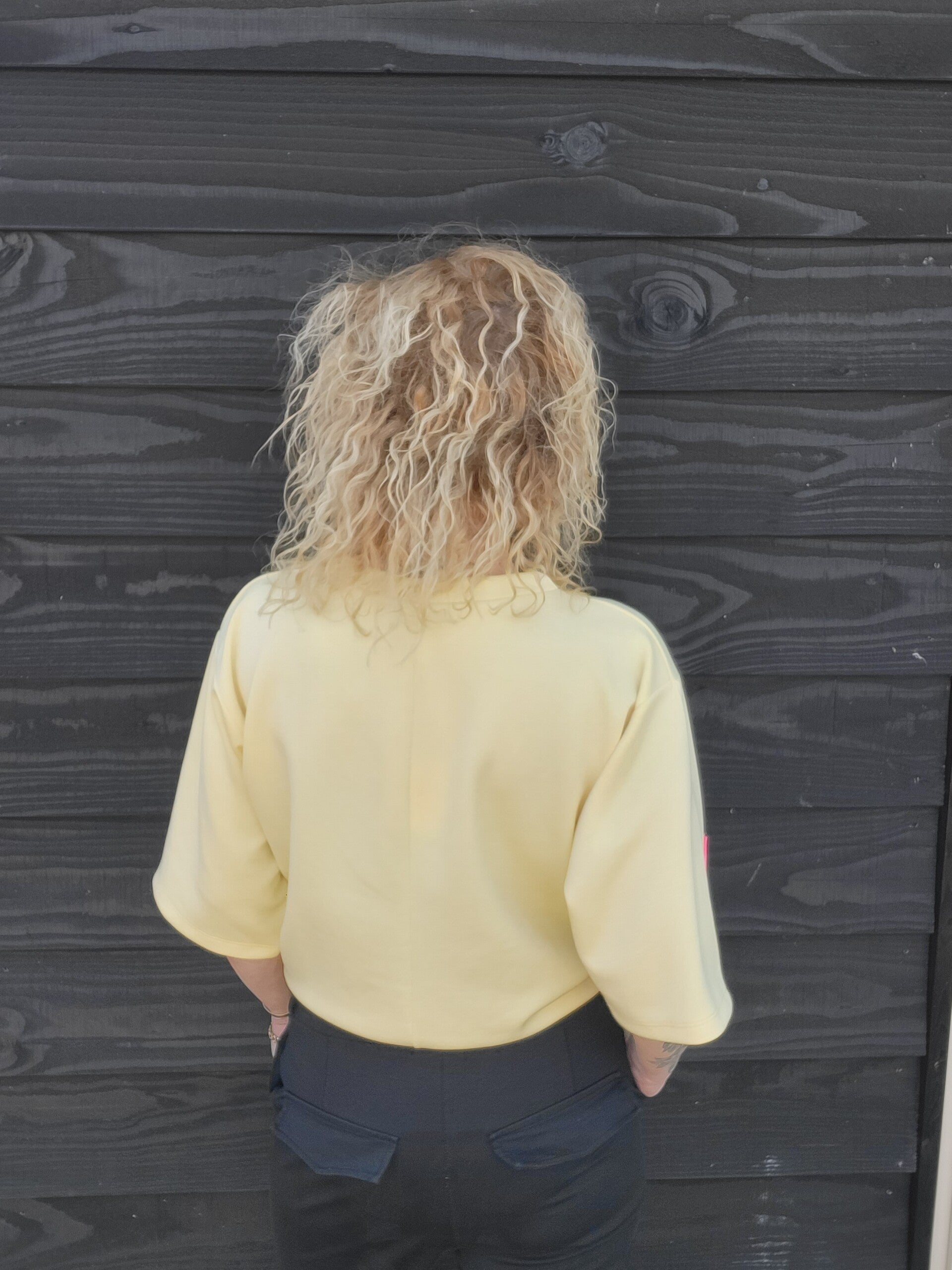 De mouwtjes vallen net wat langer en bedekken precies de bovenarmen (bye kipfilet π), en komen ongeveer tot de elleboog voor een trendy, relaxed look. Op de mouw zit een subtiel tekstje dat het shirtje nét dat beetje extra geeft β¨