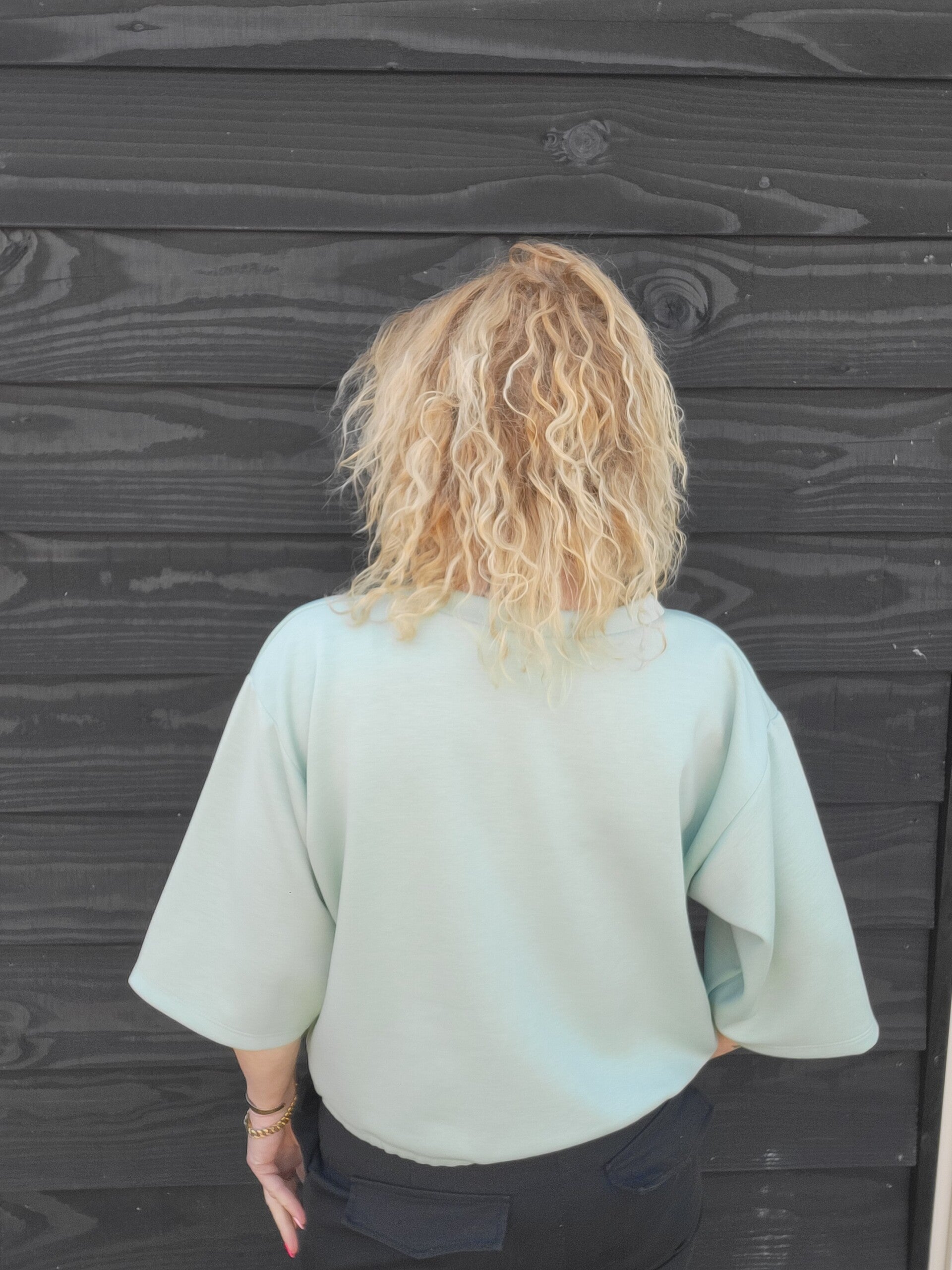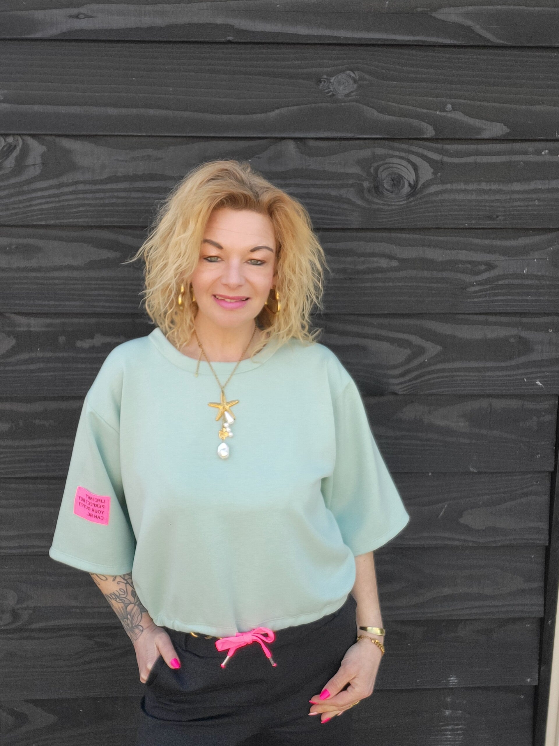 De mouwtjes vallen net wat langer en bedekken precies de bovenarmen (bye kipfilet π), en komen ongeveer tot de elleboog voor een trendy, relaxed look. Op de mouw zit een subtiel tekstje dat het shirtje nét dat beetje extra geeft β¨