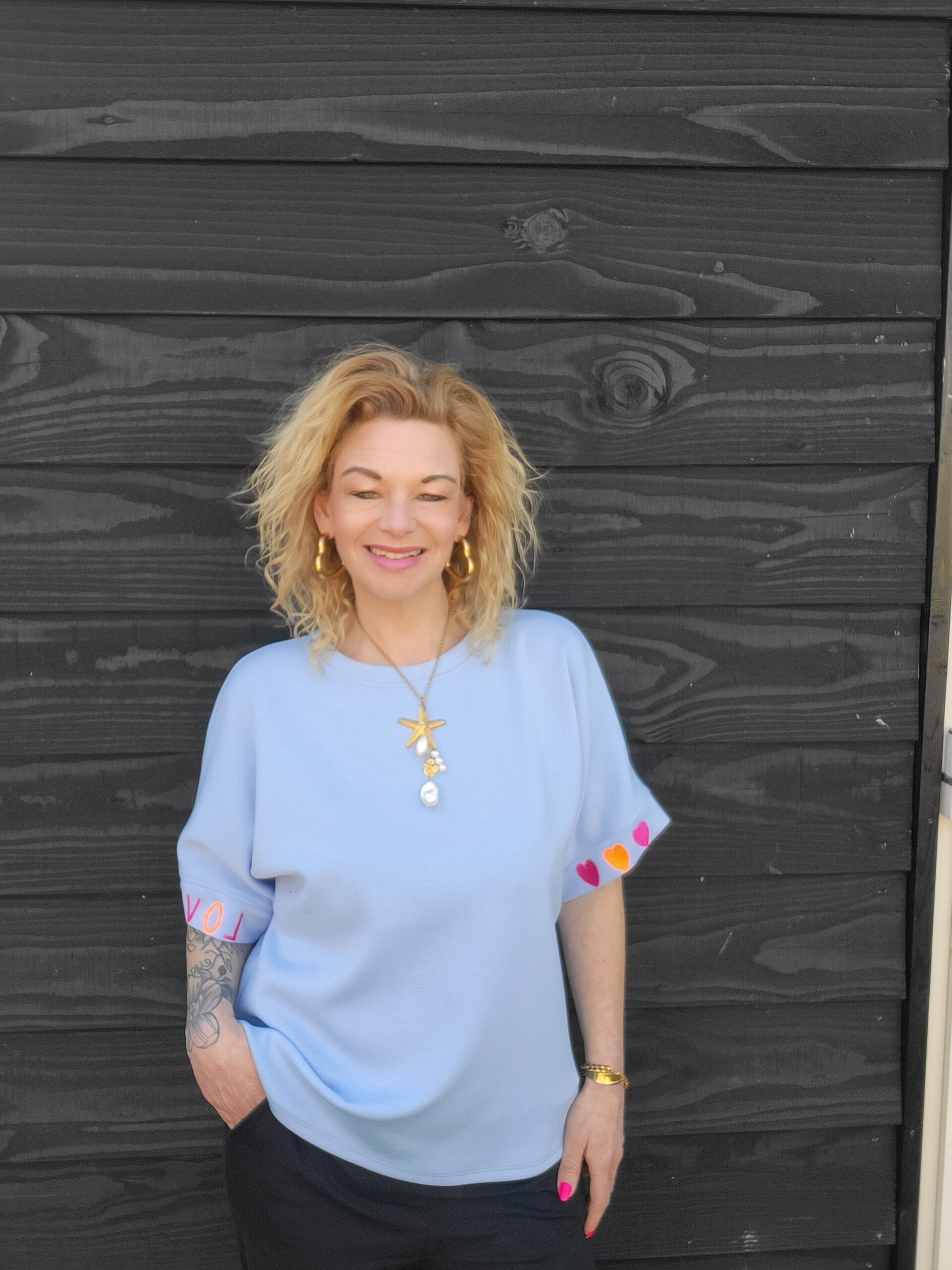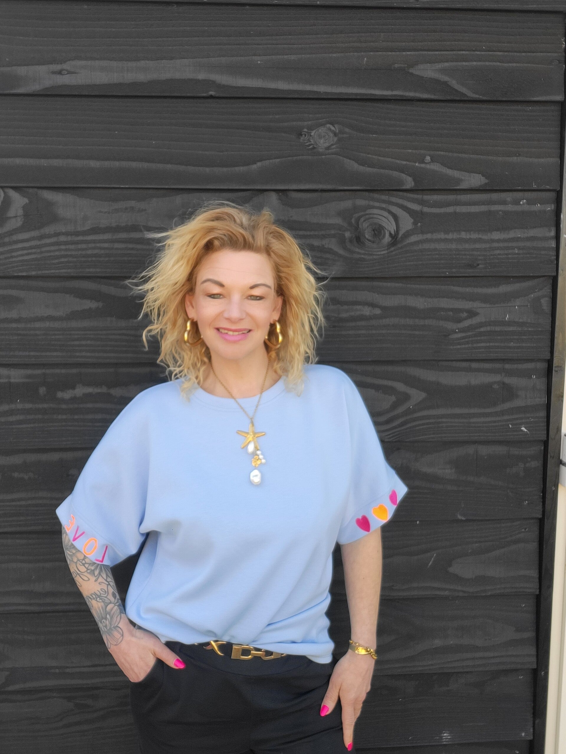 π Op de ene mouw staat het woord LOVE – subtiel maar krachtig