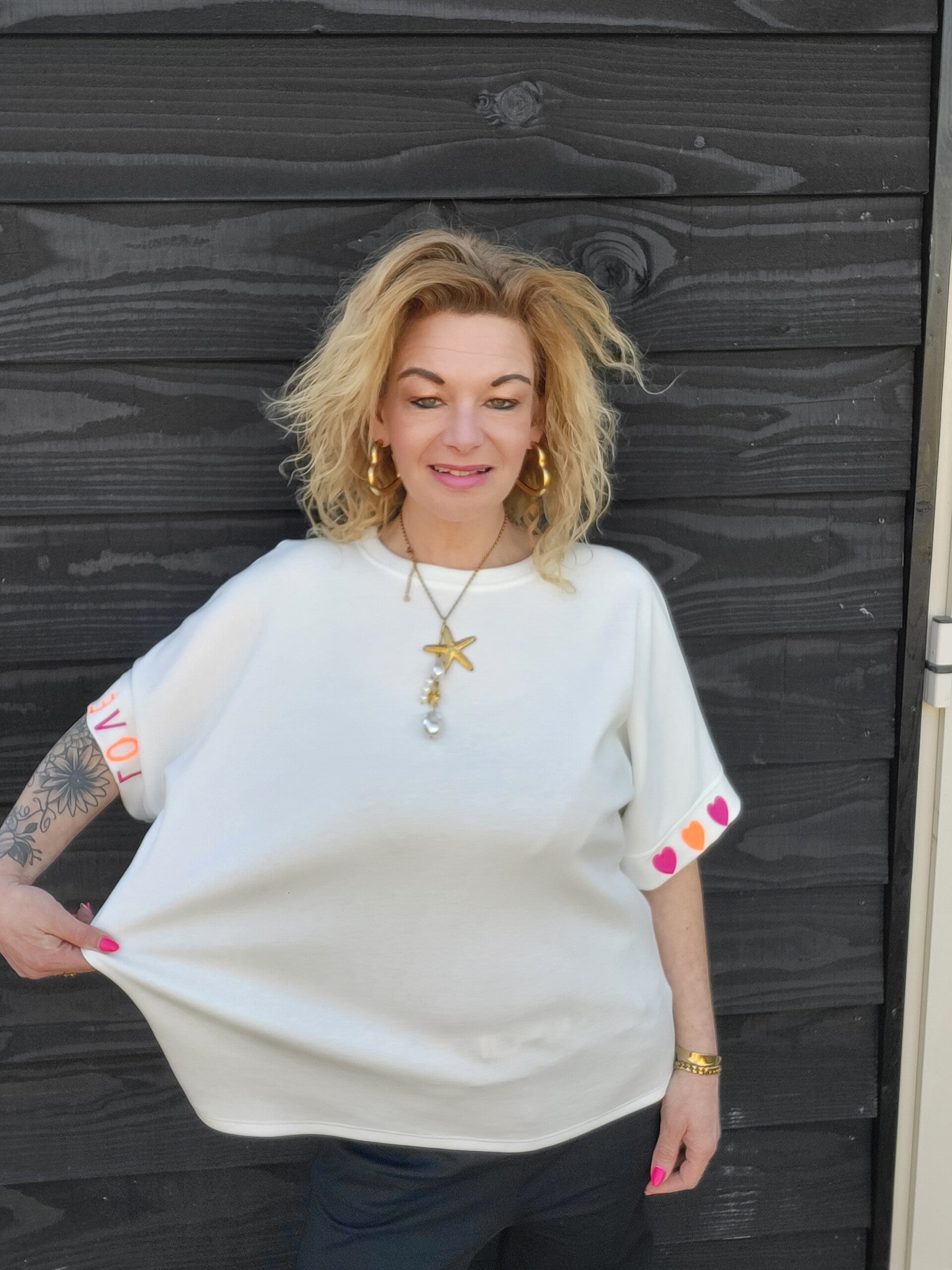 π Op de ene mouw staat het woord LOVE – subtiel maar krachtig