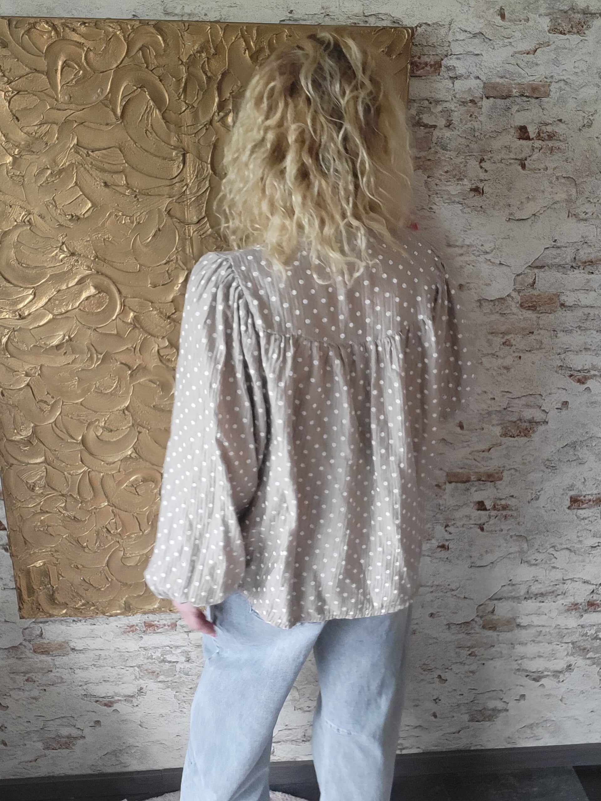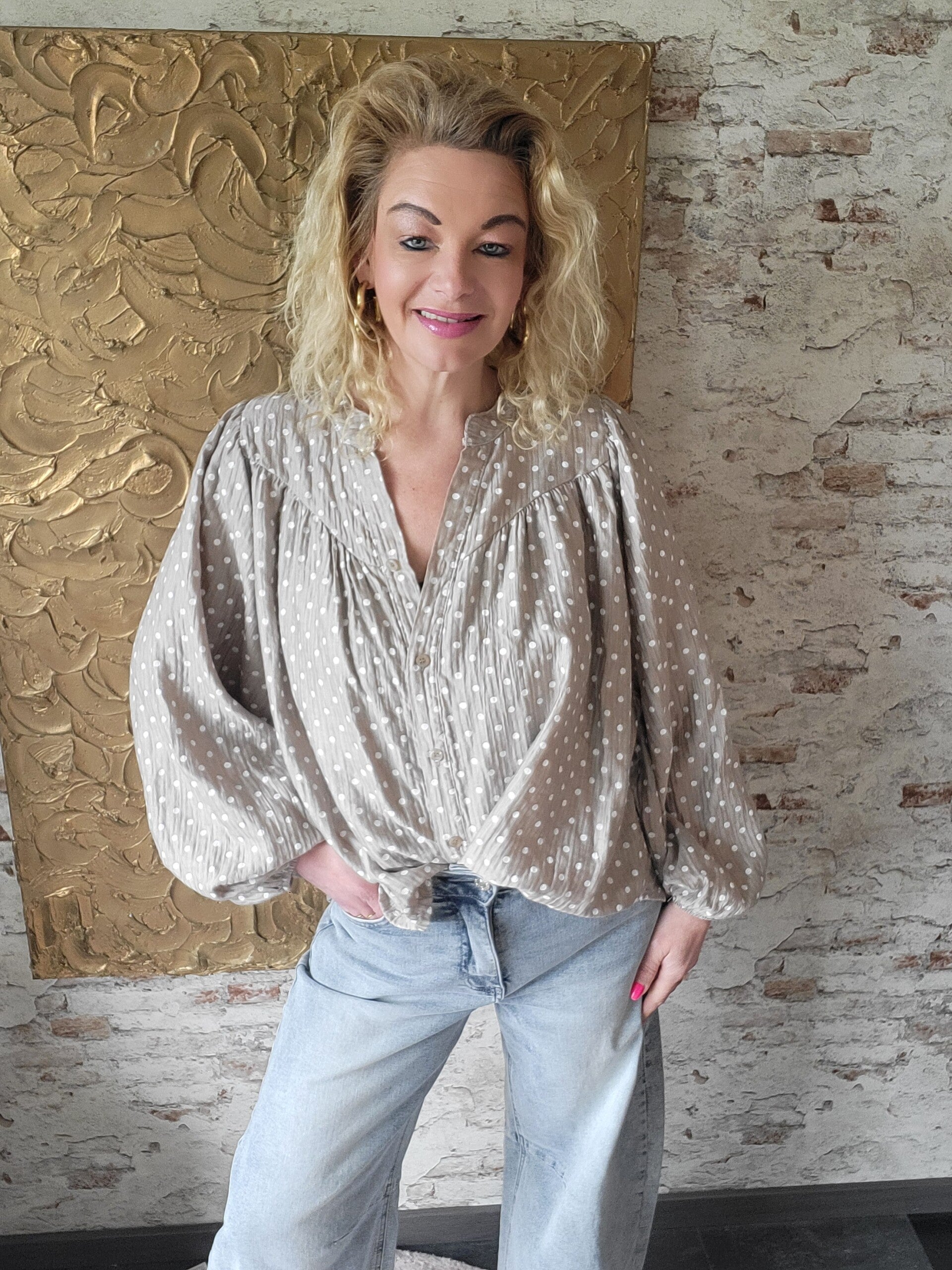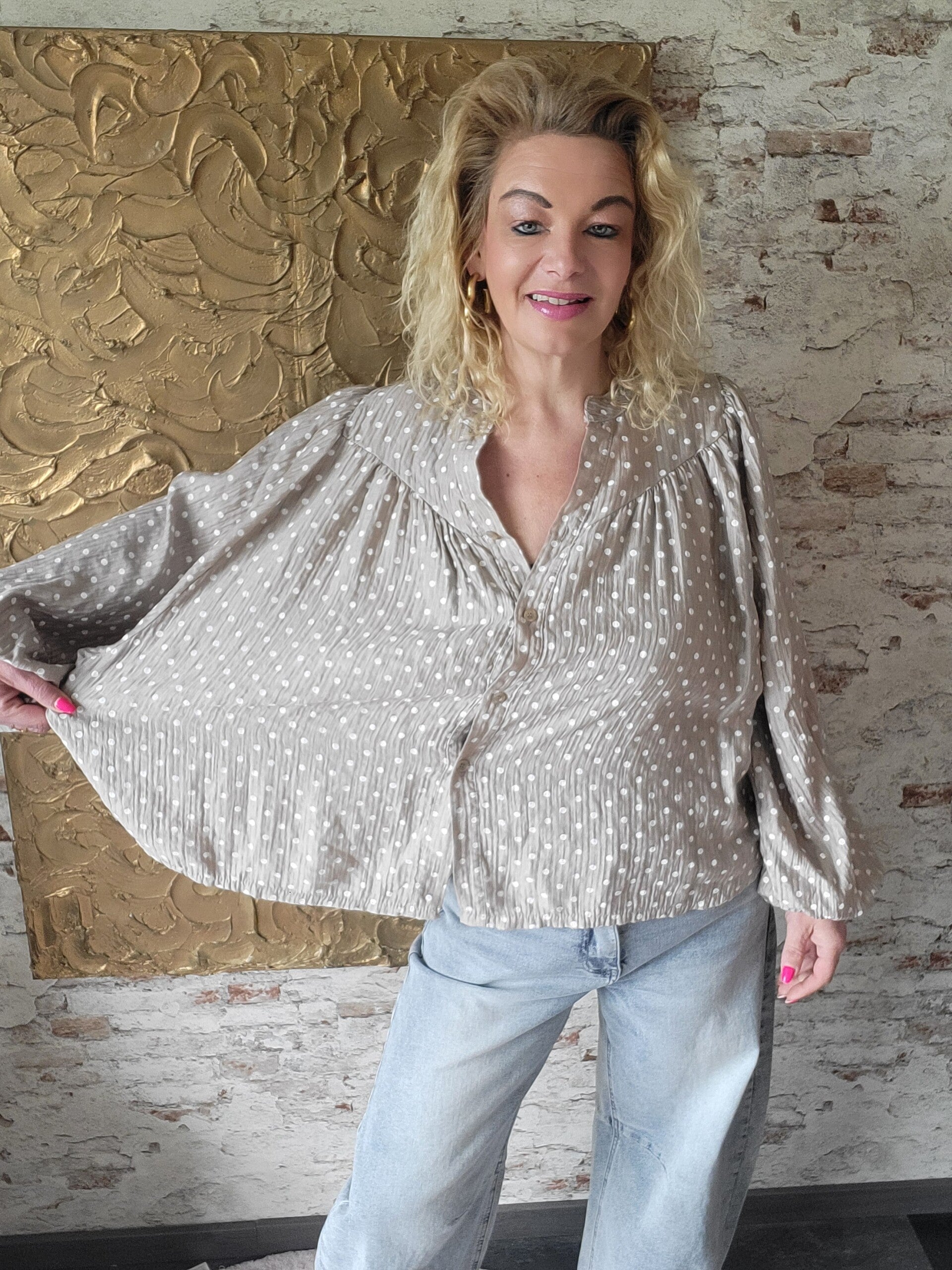Deze ruim vallende blouse met stip draagt heerlijk comforbel en is te dragen t/m maat 46
