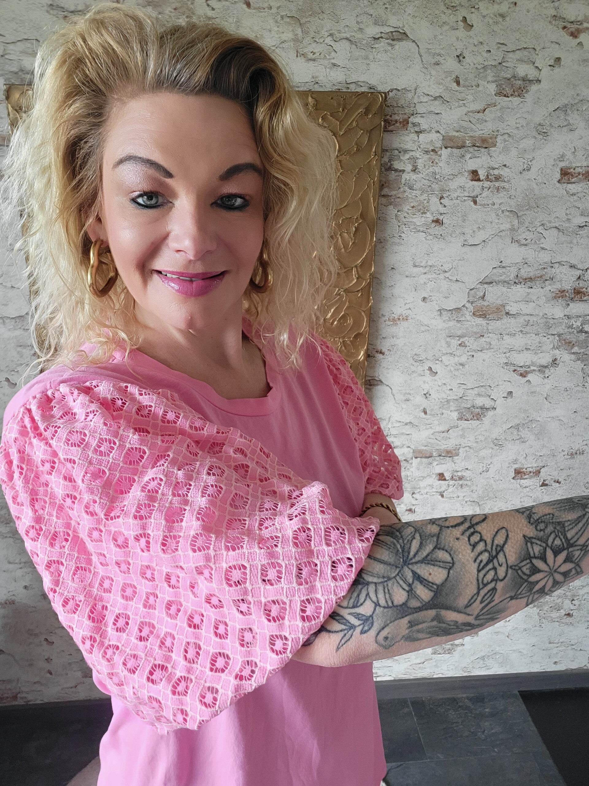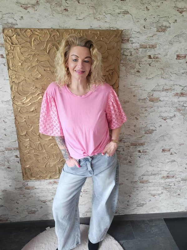 Shirt met pofmouw broderie. Knelt niet door de mouw. Sluit aan bij maat 42/44. Verkrijgbaar in meerdere kleuren