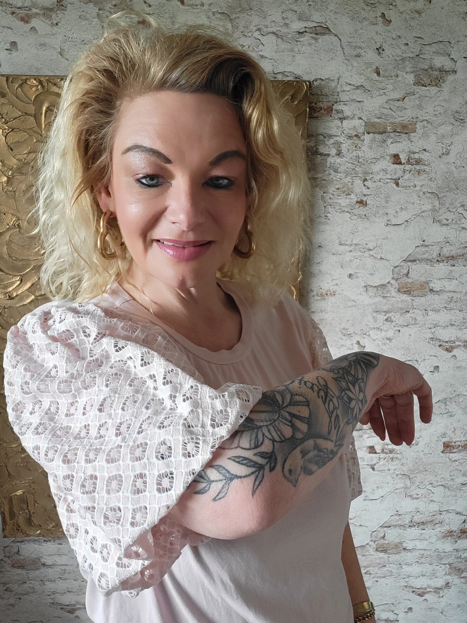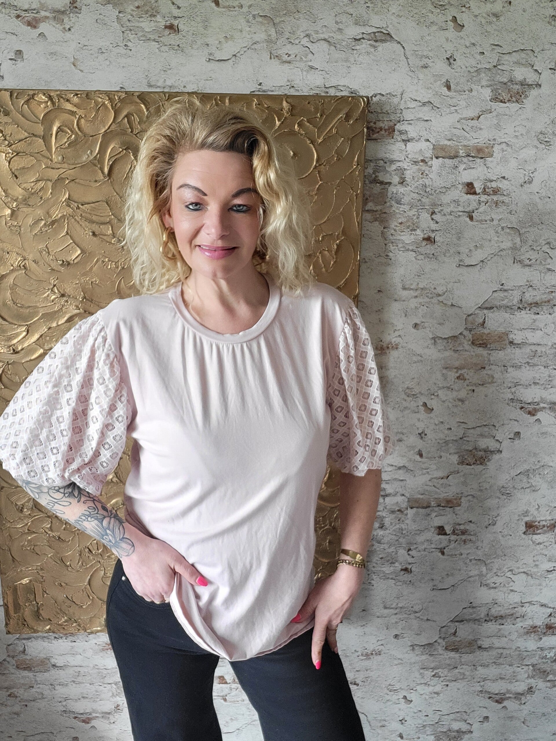 Shirt met pofmouw broderie. Knelt niet door de mouw. Sluit aan bij maat 42/44. Verkrijgbaar in meerdere kleuren