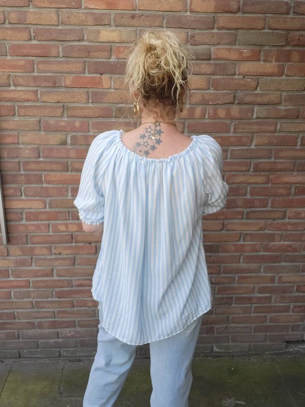 Leuk shirt met pofmouw. Bevat elastiek aan de hals zo kan je hem eventueel off shoulder dragen en elastiek aan de mouw voor de pof. Te dragen t/m maat 44
